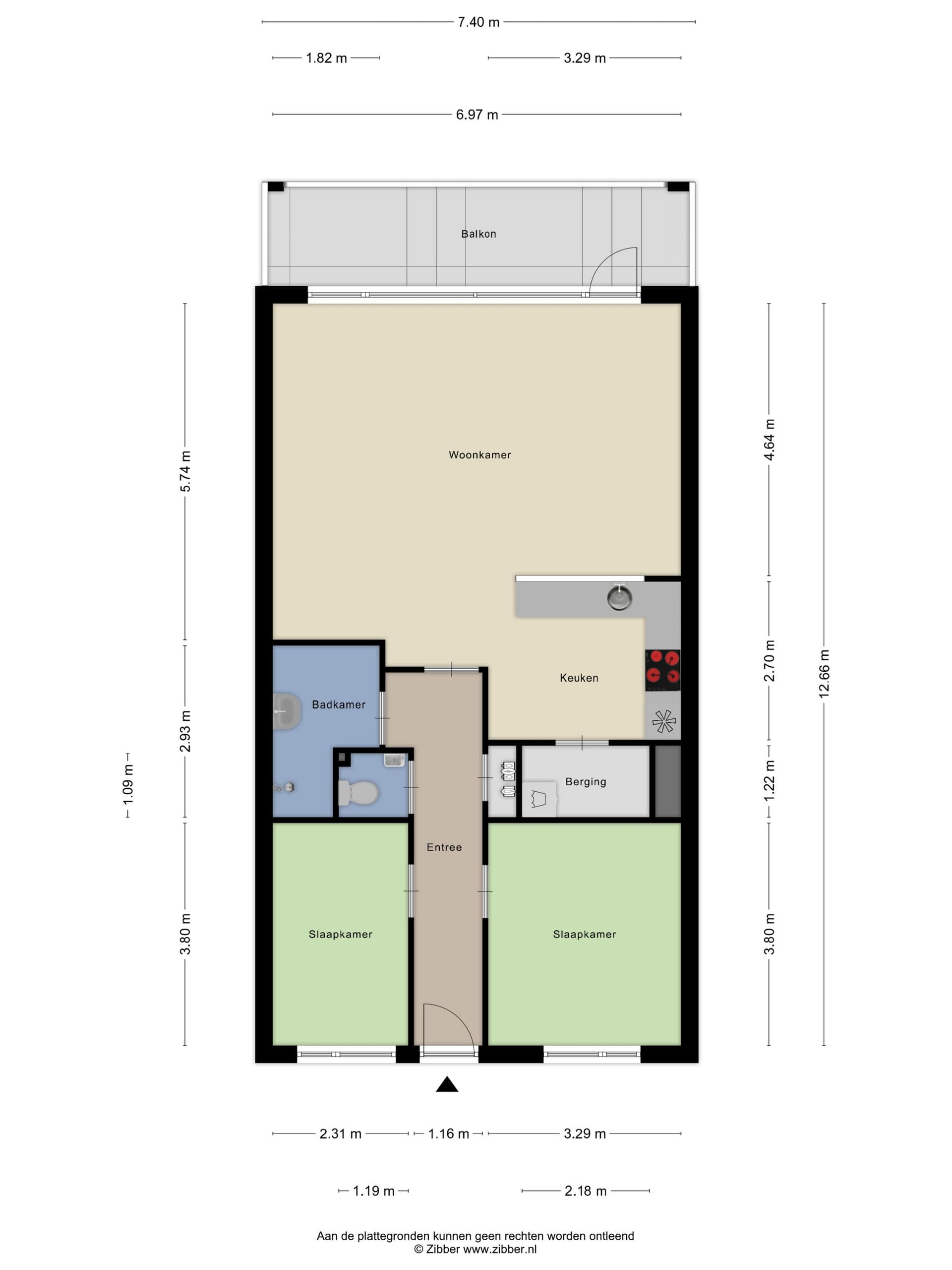 - 2 slaapkamers aan de voorzijde, ca. 12 en 9 m2