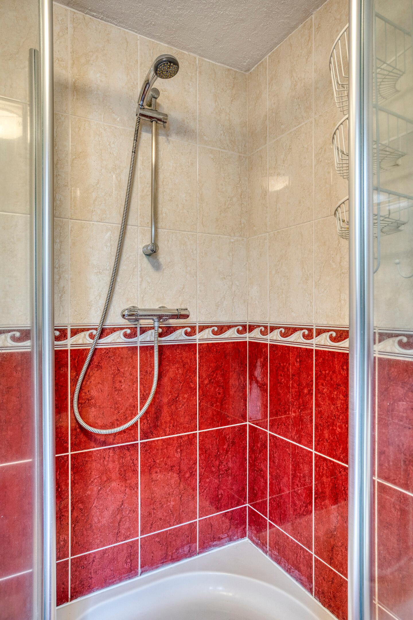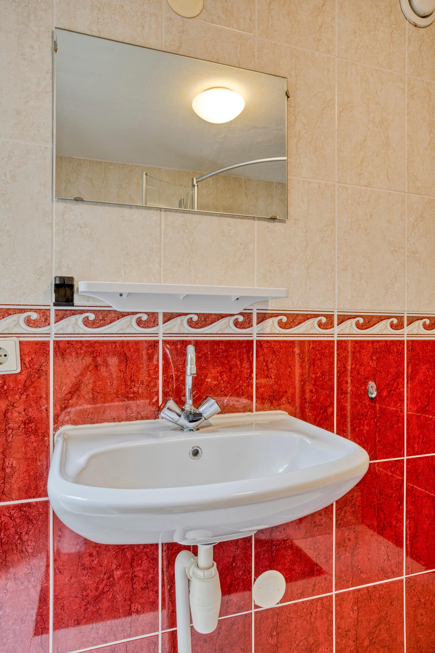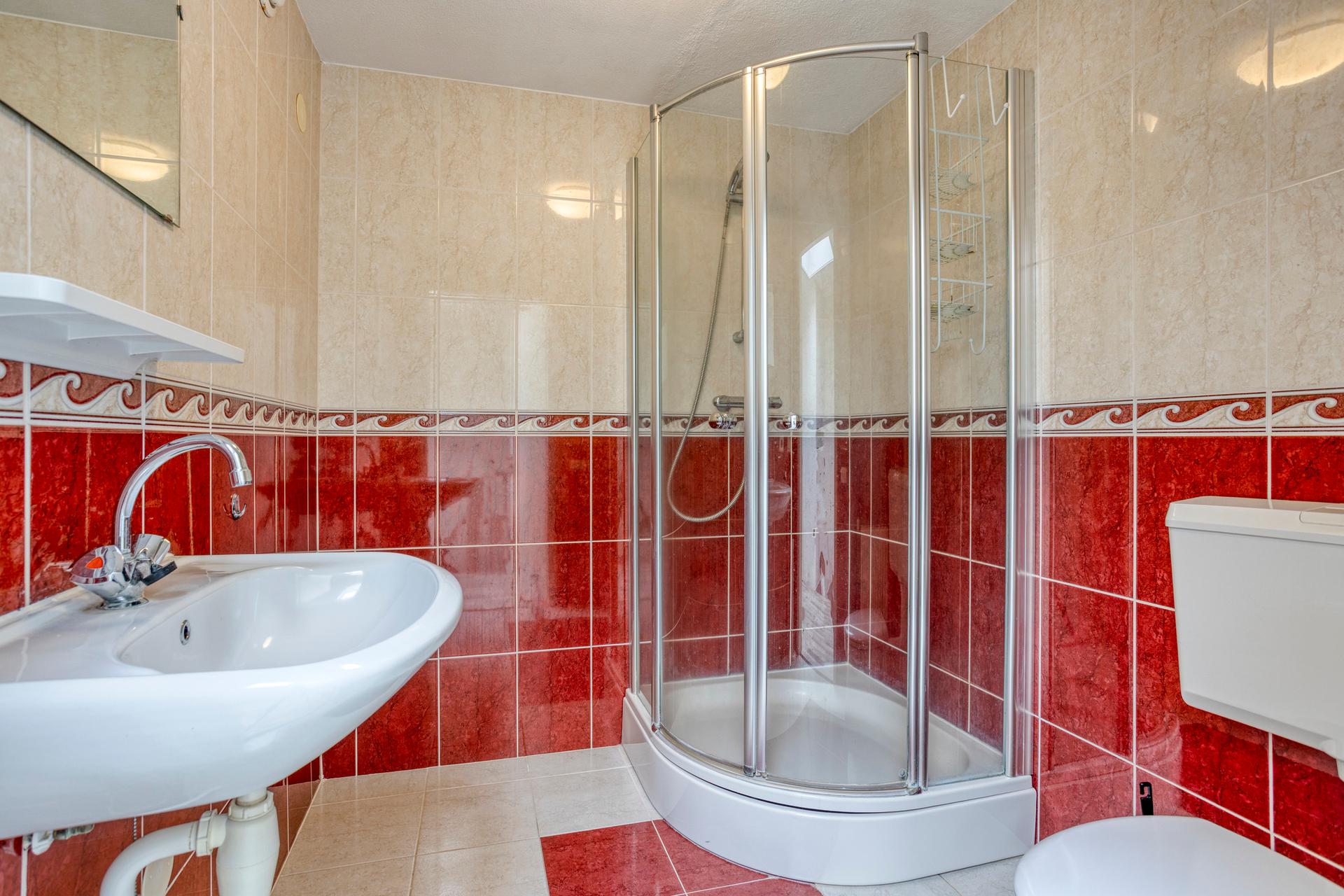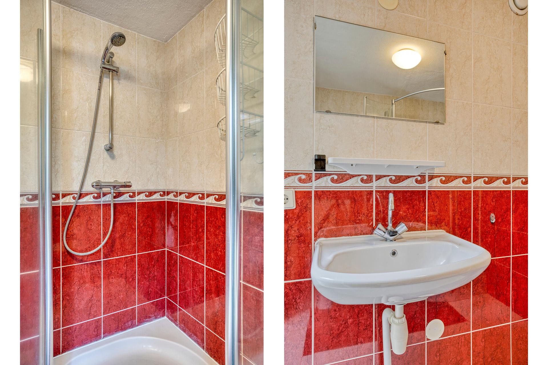 De moderne badkamer van ca. 4 m2 is voorzien van een wastafel, radiator, douchecabine en staande toilet.