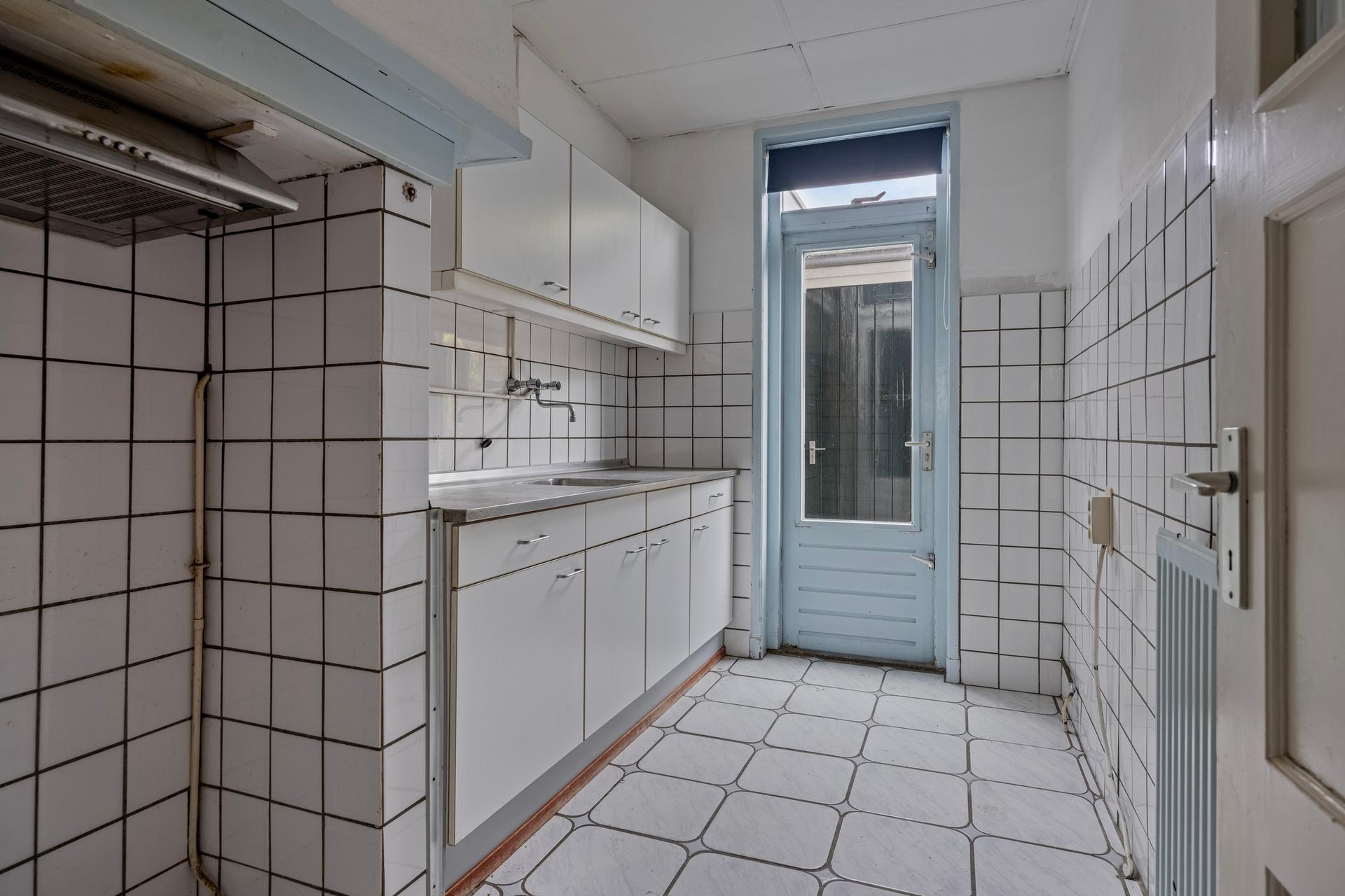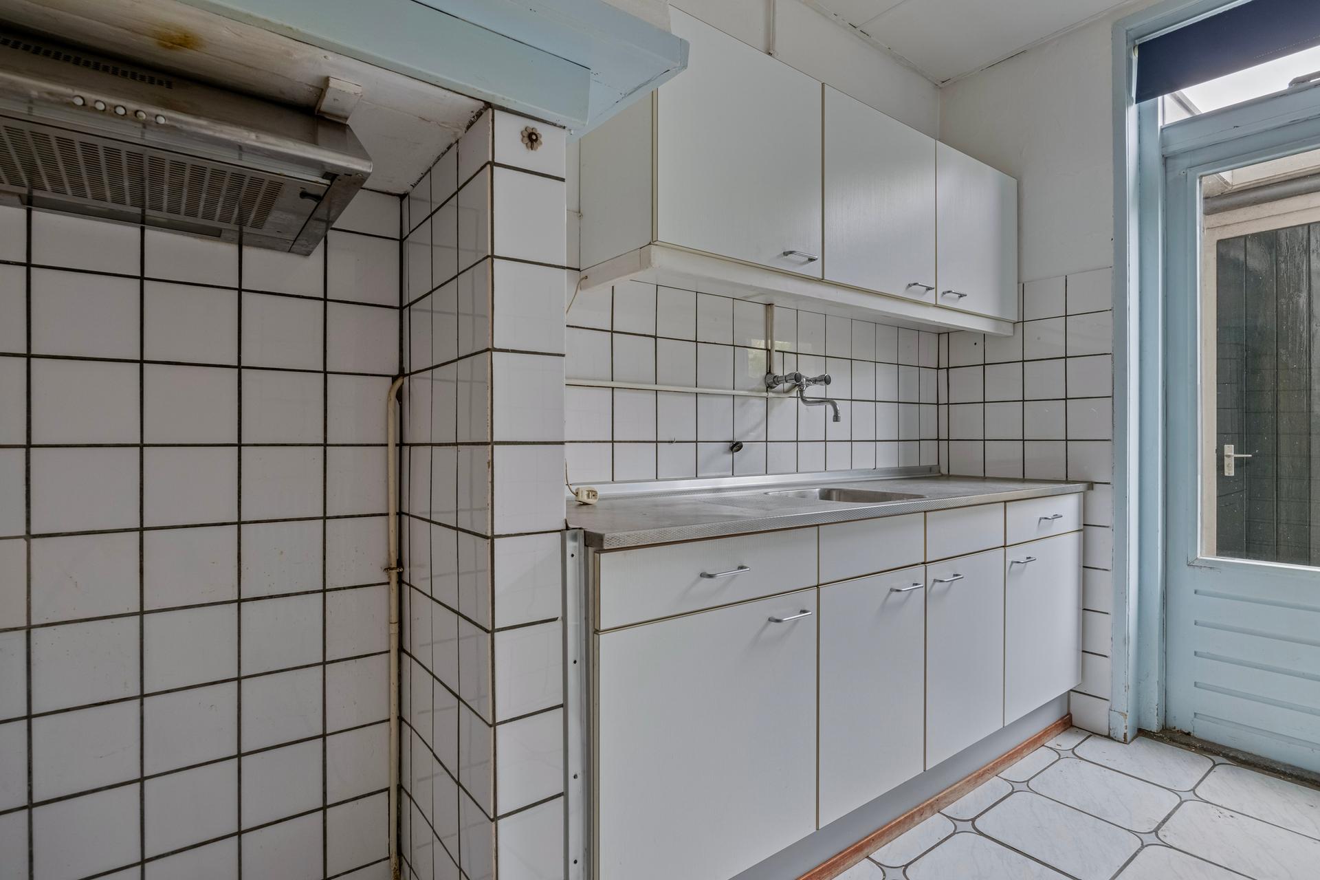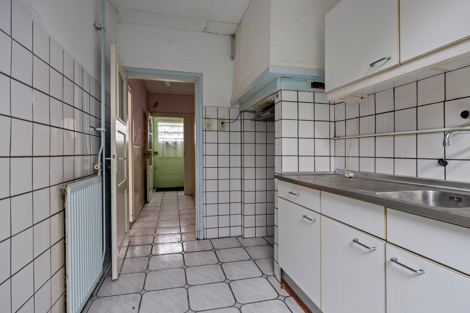 - Eenvoudige keuken, ca. 7m2, , eveneens met toegang tot achtertuin en stenen berging