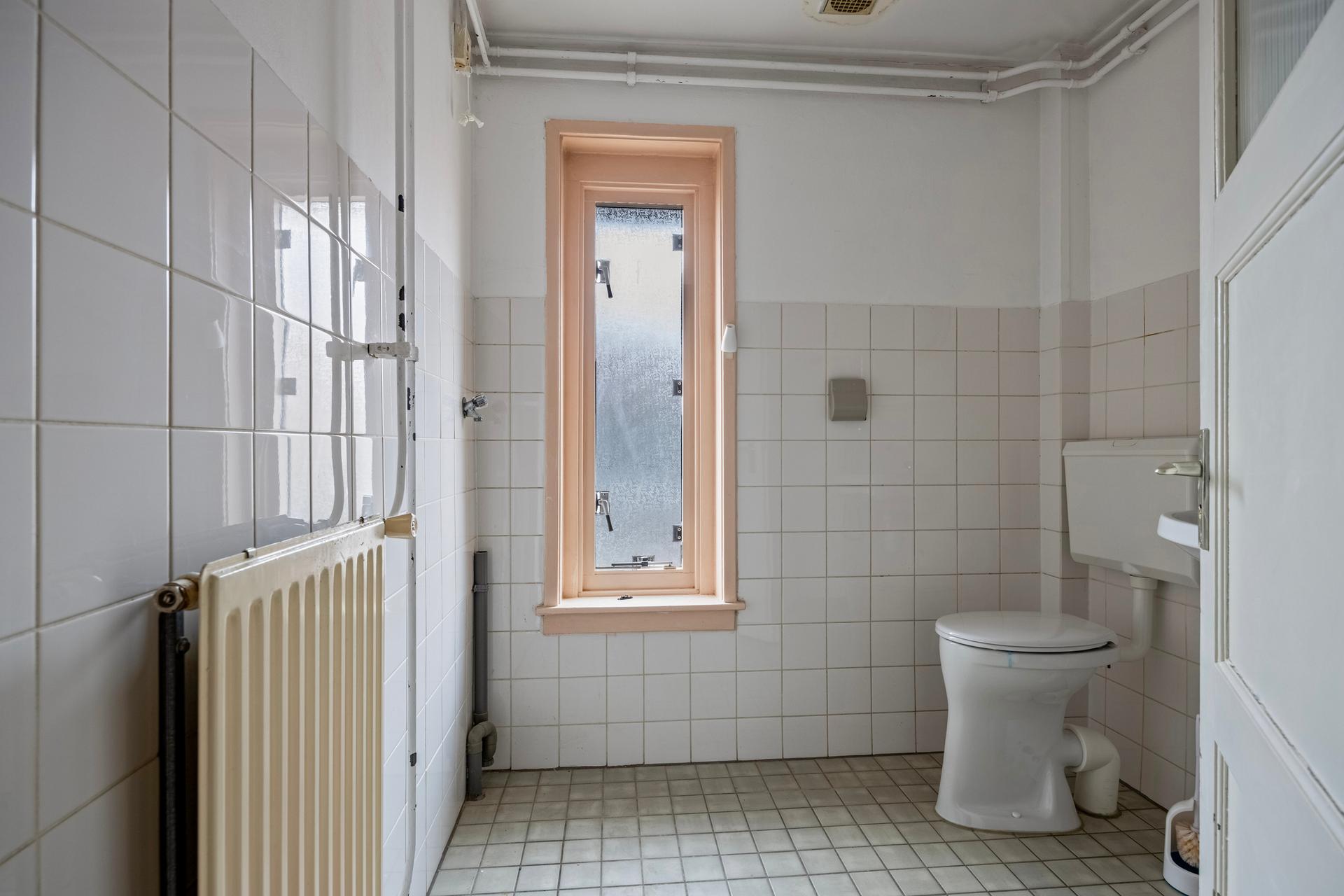 - Gedateerde badkamer met wastafel. inloopdouche en toilet