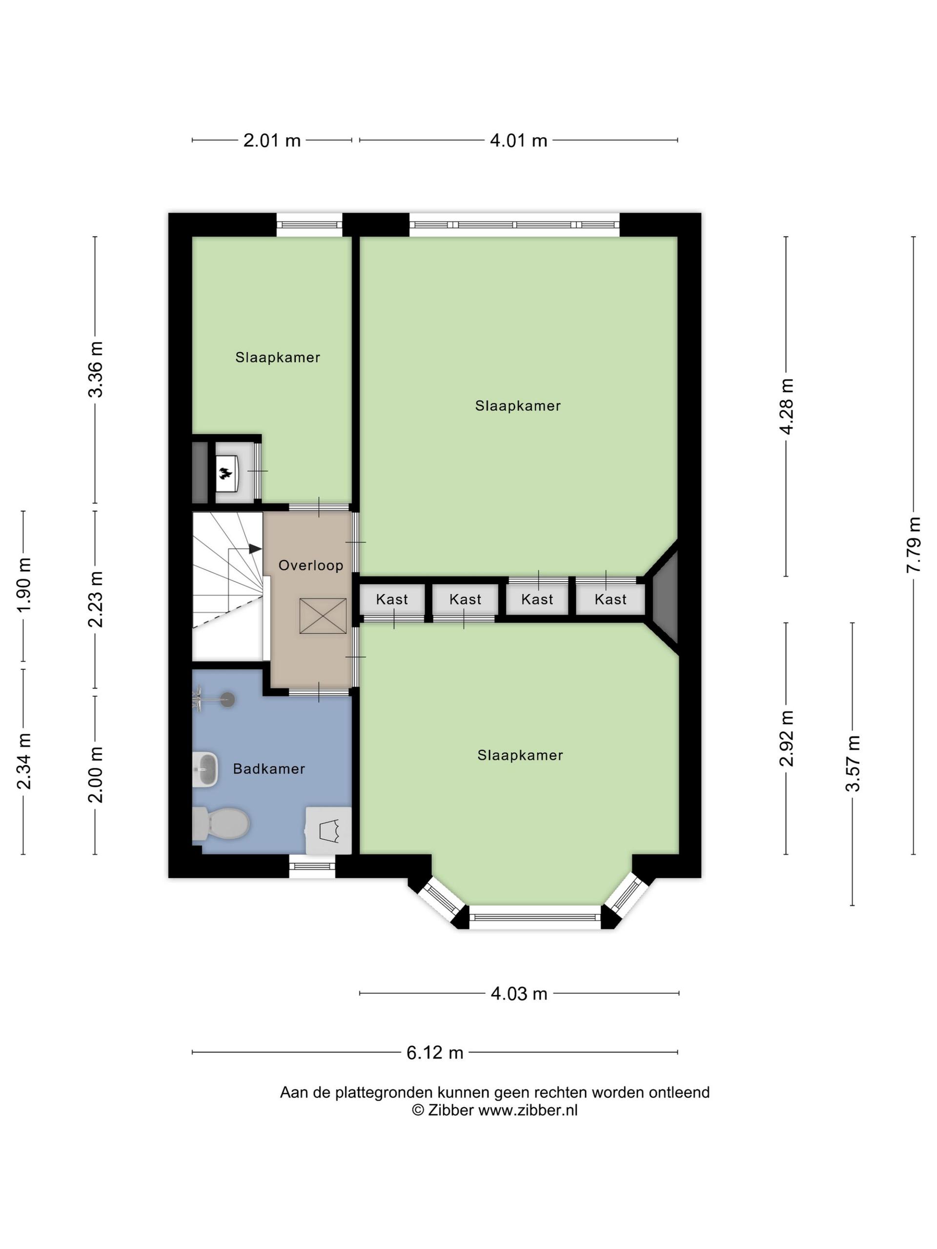 - 1e etage overloop met drie slaapkamers, 19m2, 15m2 en 7m2